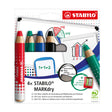 Creionul marker STABILO MARKdry intr-un etui din carton de 4 culori, inclusiv o ascutitoare si o carpa de stergere.
