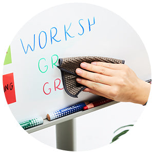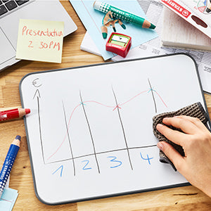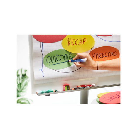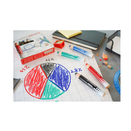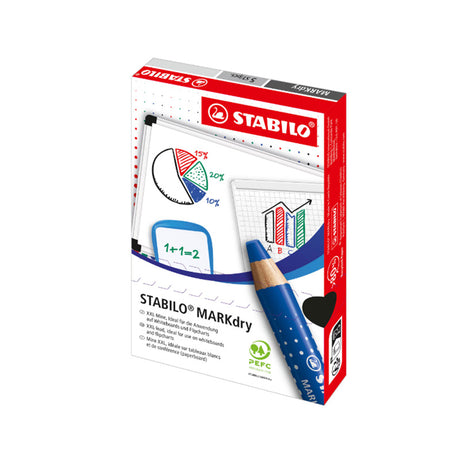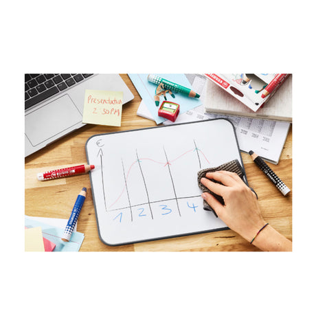 Creioane Stabilo Mark Dry pentru tabla, 4 culori, cu ascutitoare si laveta
