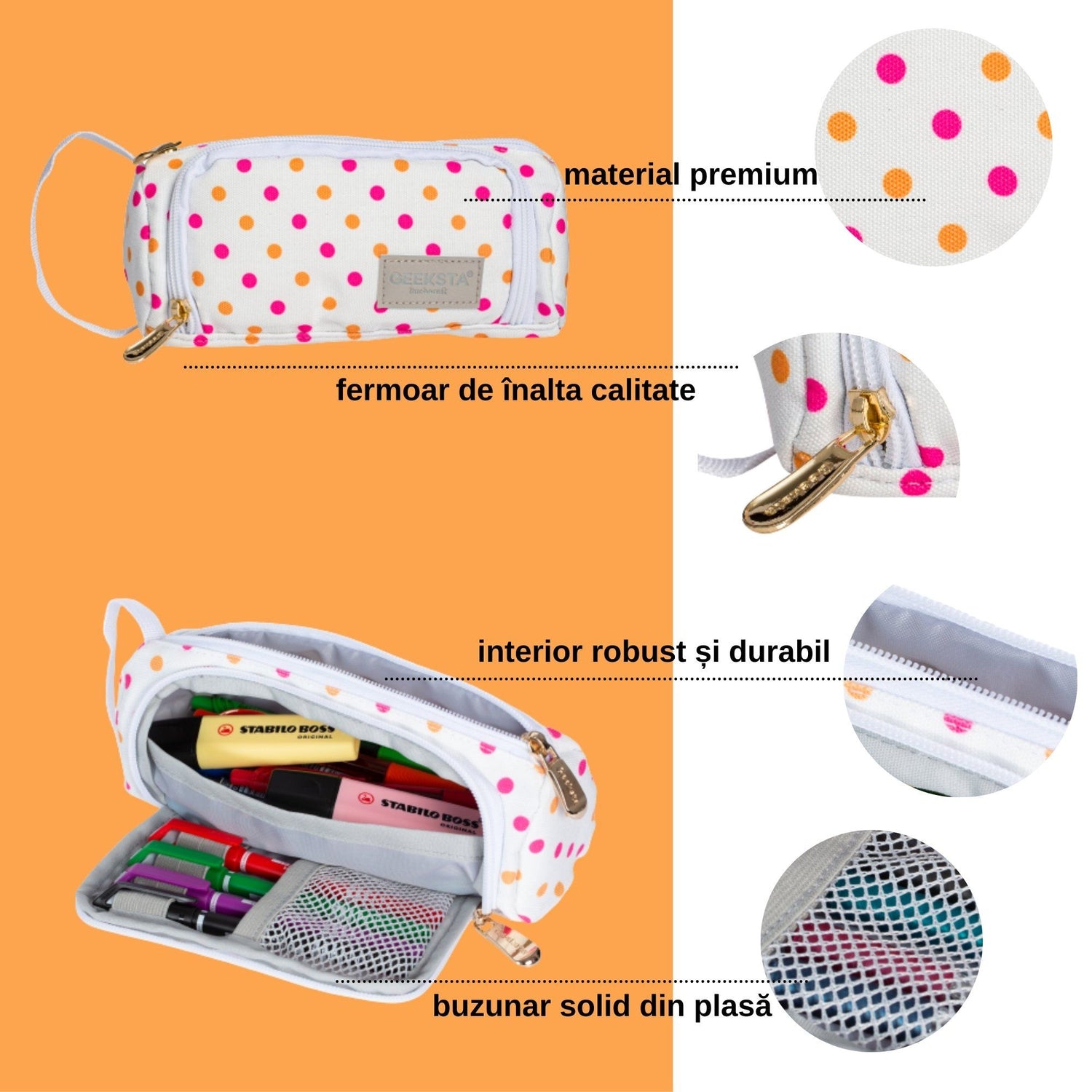 - Material premium – penarul este confectionat dintr-o tesatura de inalta calitate, lavabila si rezistenta la uzura, durabila. Materialul folosit protejeaza continutul din interior, facandu-l practic in viata ta de zi cu zi!