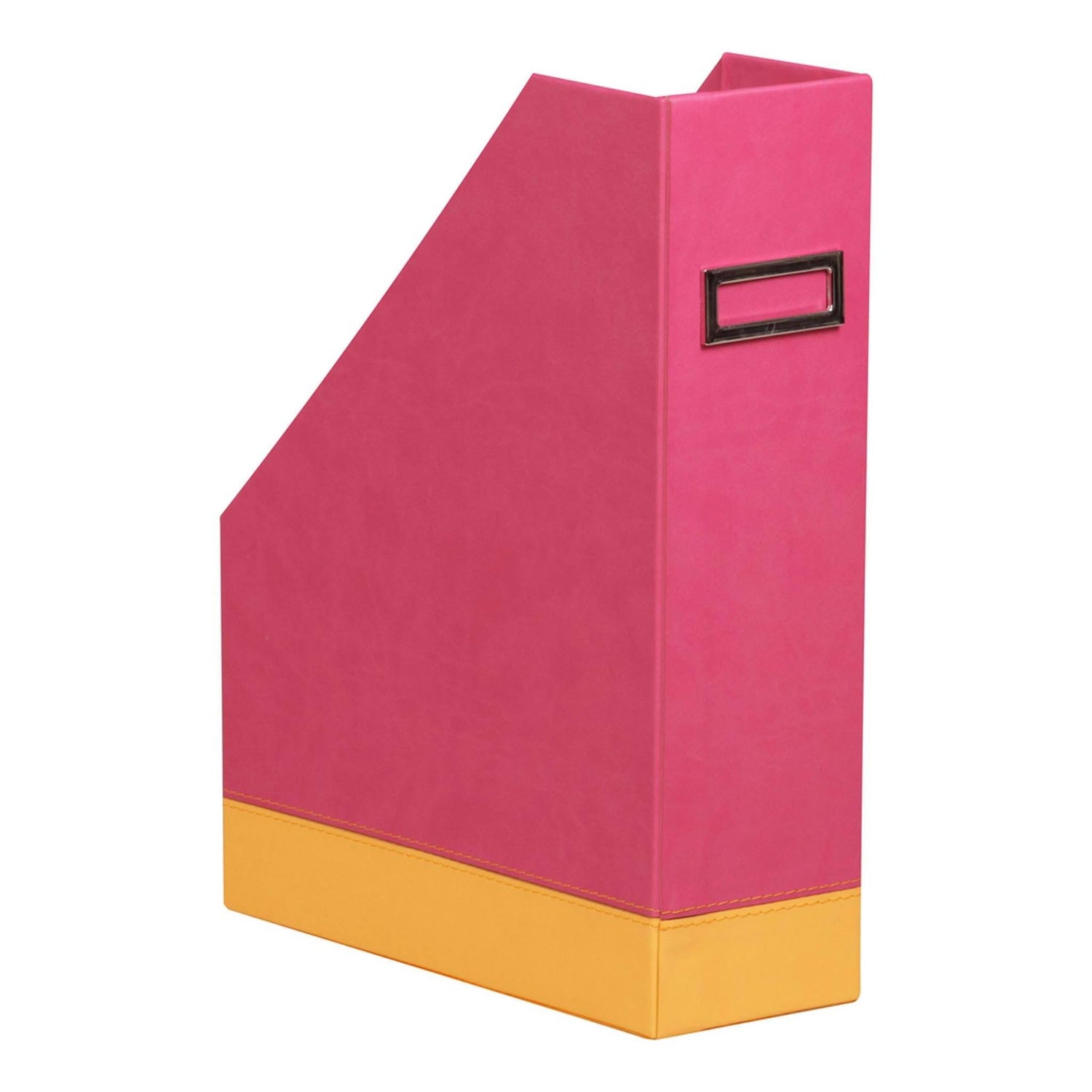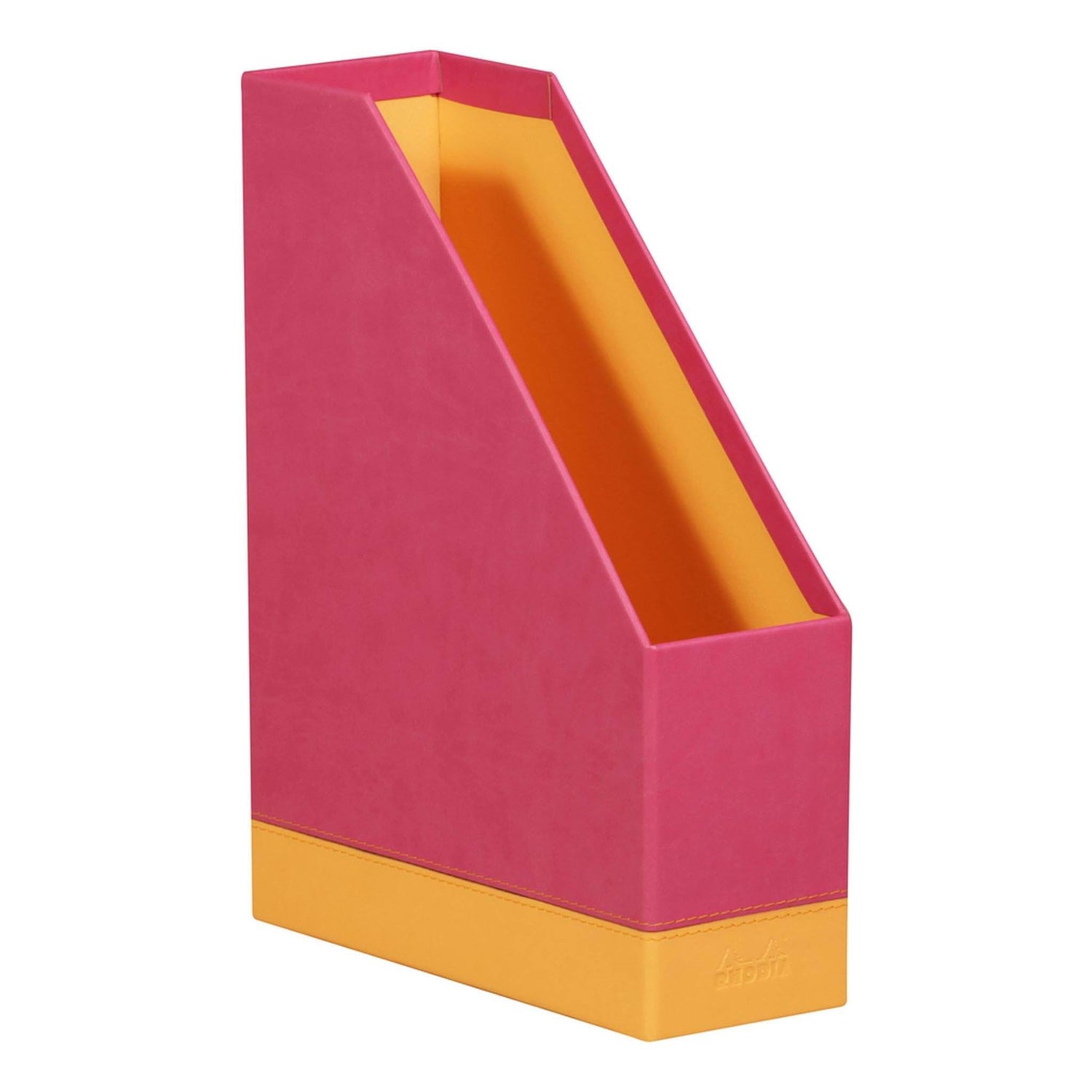Suport vertical pentru documente, reviste sau cataloage, din imitatie italiana de piele cu sigla Rhodia embosata, cusatura portocalie in relief si suport de eticheta din metal